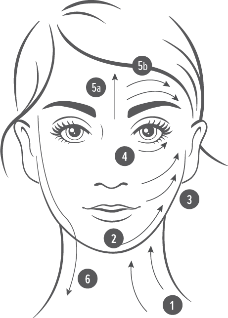 - Lopuksi voit koota lymfanesteet ja viedä ne imusolmukkeisiin. Aseta Gua sha otsan keskiosaan kupera puoli kohti kasvoja. Liikuta välinettä kevyesti alas kasvojen sivuja myötäillen kohti kaulaa ja solisluuta